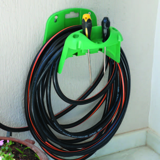 Wall mount for garden watering hose, with tool mounts, excellent quality and availble in various colors.